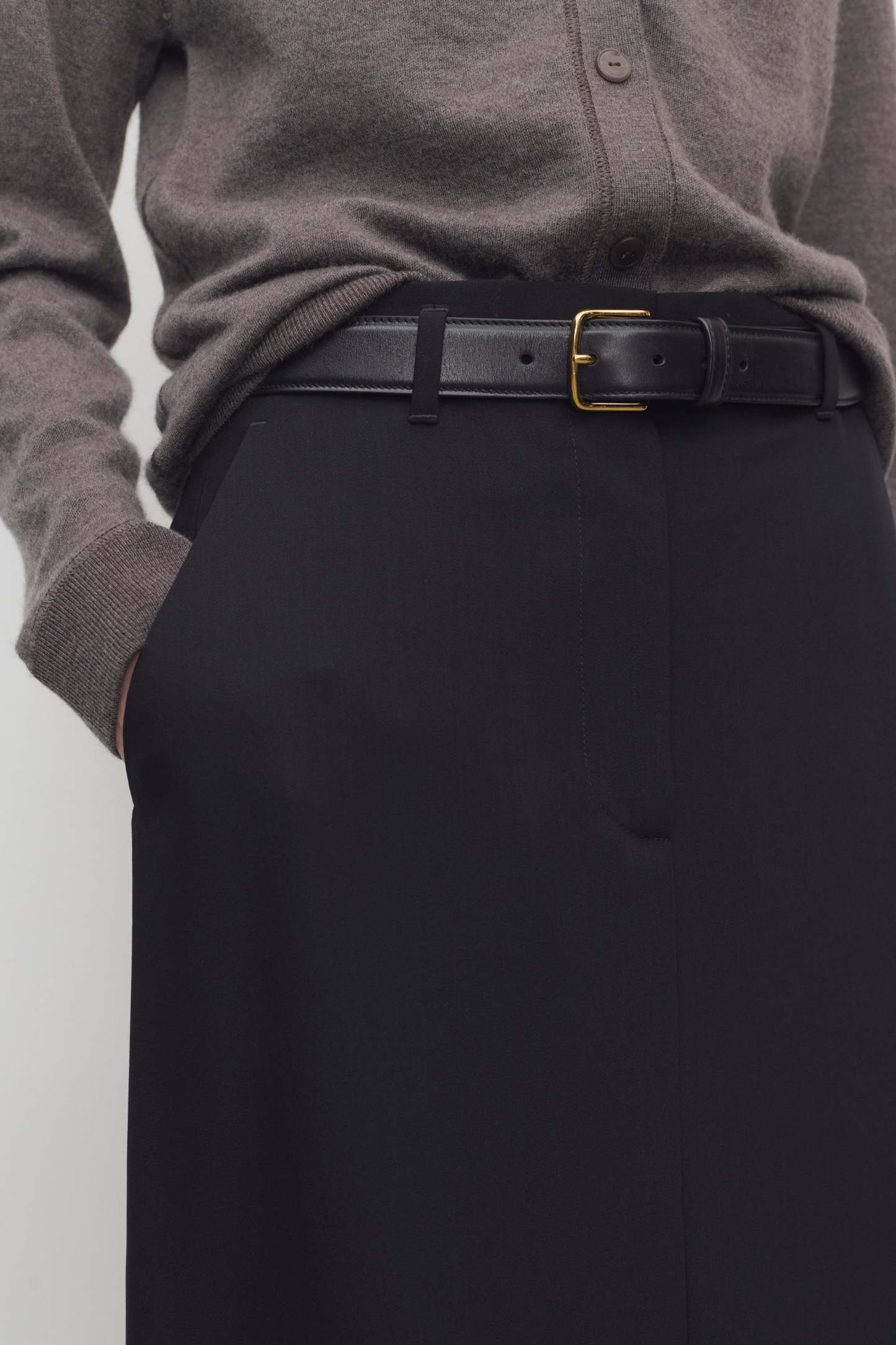 Floor-length column skirt in smooth virgin wool gabardine with tailored waistband, side and back pockets, and front fly zip closure.
